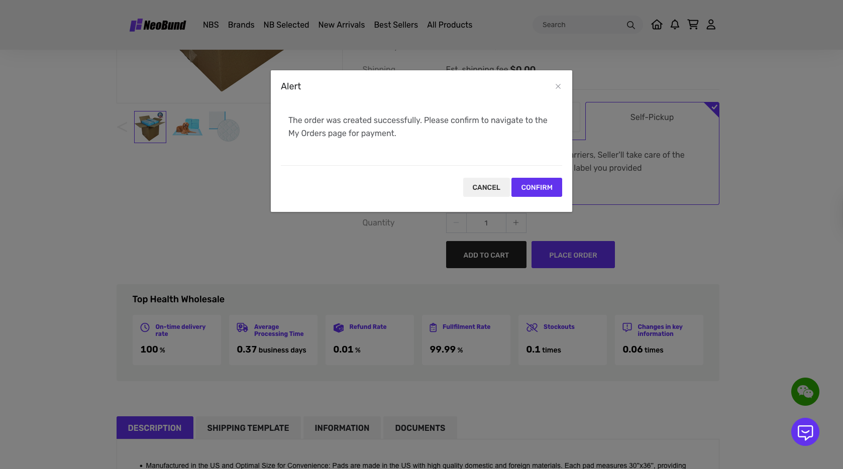 如果您是Self Pickup,点击PLACE ORDER,点击CONFIRM。随后到订单列表界面付款订单,并且上传快递面单即可。